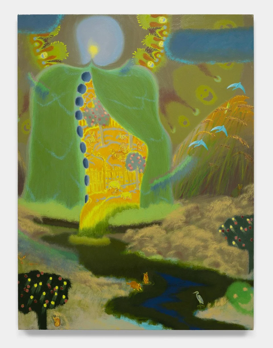 exploratory acts, she often begins with poetry, everyday observations, or other stimuli that instigate a movement of her brush. A smiling tyger (channeling William Blake), a jeweled arachnid, or a glowing, fantastical landscape are at once familiar and enticingly otherworldly. Melting into their hallucinatory environs, Feng’s subjects adhere to an internal logic outside of our own daily existence that nevertheless beckons us inward.